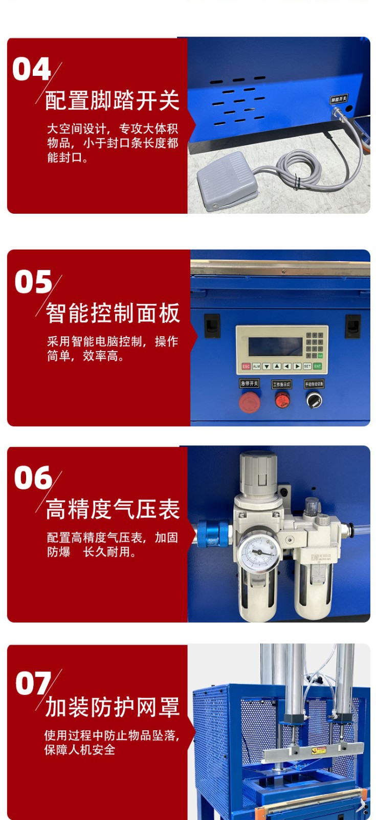 - 壓力大小:合適的壓力能使包裝材料在加熱時(shí)充分接觸并融合,形成牢固的封口。壓力不足,封口處無(wú)法完全密封,會(huì)出現(xiàn)漏縫。壓力過(guò)大,可能會(huì)使包裝材料過(guò)度擠壓、變形,甚至損壞,尤其是對(duì)于一些質(zhì)地較軟或較薄的材料,容易導(dǎo)致封口處破裂或材料內(nèi)部結(jié)構(gòu)受損。