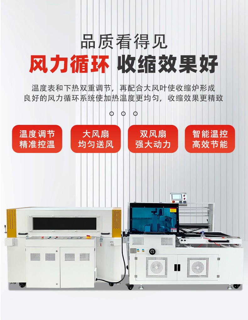 - 自動(dòng)化程度高:配備 PLC 控制系統(tǒng)和光電感應(yīng)裝置,可自動(dòng)完成送膜、封口、熱收縮、出料全流程,無(wú)需人工干預(yù)。