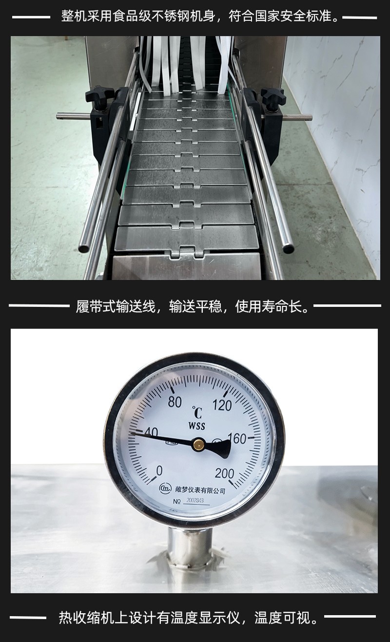 - 加熱效果優越:利用蒸汽恒溫且溫度擴散均勻的特性工作,能達到普通電熱紅外加熱收縮機不可比擬的效果。設備采用加熱器加熱水產生蒸汽,無需另外配備蒸汽鍋爐。主機有主副 2 個加熱器,可根據生產速度調節功率大小,輸送帶采用無級調速,輸送速度可任意調節。