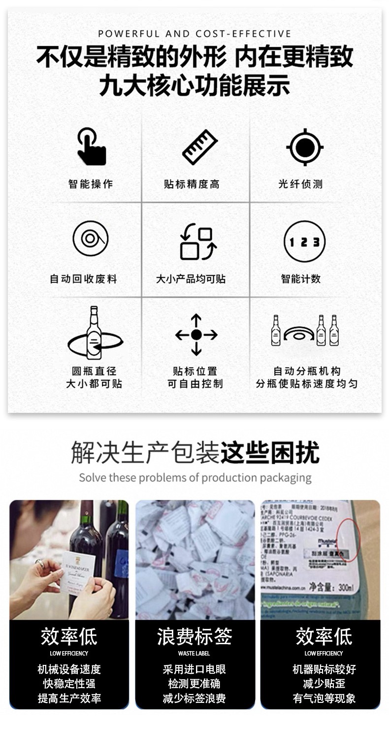 自帶 “自動分瓶、無瓶不貼標、缺標報警” 功能,無需人工分揀瓶子或監控標簽供給;部分機型還支持與前后生產線(如灌裝機、裝箱機)聯動,形成全自動化包裝流程,降低人工搬運和操作失誤的風險。