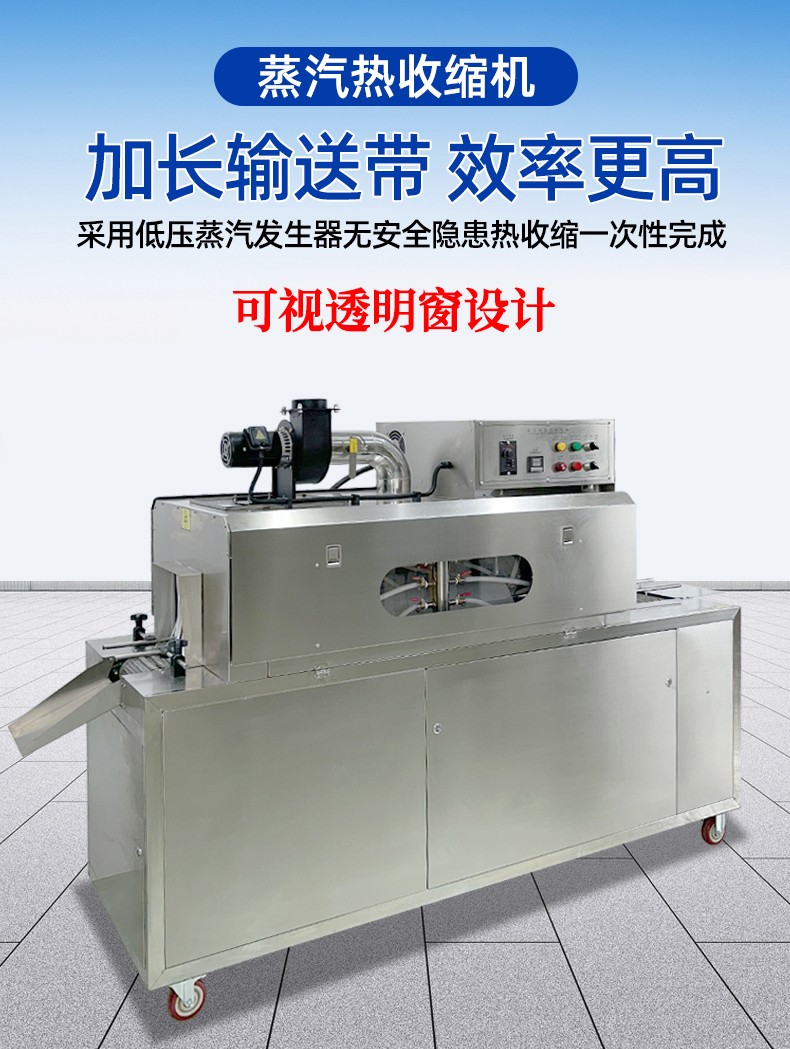 1. 減少設備占用空間,適配多場景布局需求傳統蒸汽收縮包裝方案中,獨立蒸汽發生器體積較大,需與收縮機分開放置,還需預留管道連接的空間,整體占地面積大,對廠房面積較小的中小企業或生產線布局緊湊的場景極不友好。而蒸汽收縮一體機通過結構優化,將蒸汽發生模塊內嵌于設備主機框架內,采用垂直分層或側置內嵌的緊湊設計,整體占地面積相比 “分體式設備組合” 減少 30%-50%。這種集成化設計不僅能輕松適配車間狹窄區域、流水線嵌入式工位,還可靈活移動至臨時包裝作業區,無論是固定生產線還是臨時加工點,都能高效利用有限空間。