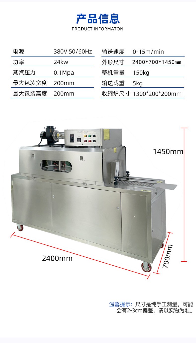 2. 簡化安裝流程,降低施工與調試成本分體式設備的安裝涉及多道復雜工序:需單獨規劃蒸汽發生器的擺放位置、鋪設蒸汽輸送管道、安裝閥門與壓力表,還要進行管道密封測試,防止蒸汽泄漏,整個過程需要專業的安裝團隊操作,耗時耗力,且后期易因管道接口問題出現故障。蒸汽收縮一體機在出廠前已完成蒸汽發生器與主機的管路連接、密封測試和參數預調試,用戶采購后僅需三步即可完成安裝:一是接通 380V 工業電源(或對應電壓電源),二是連接進水管與排水管,三是進行簡單的水平校準。無需額外雇傭專業施工團隊,也無需投入管道、閥門等輔材成本,一般技術人員即可在 1-2 小時內完成安裝并投入試機,大幅縮短生產線的投產周期。