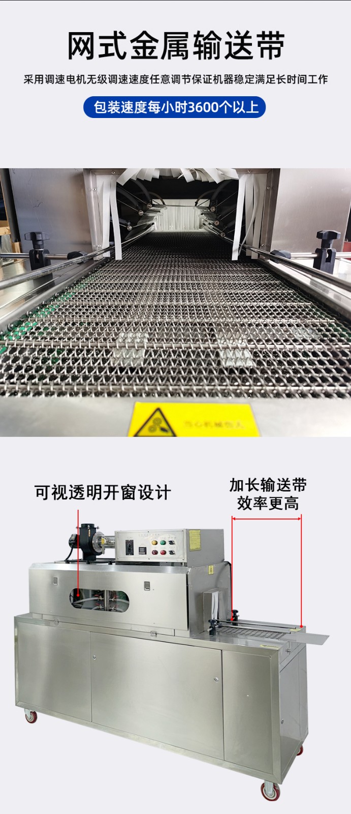 • 輸送系統:用于將待包裝的產品輸送到蒸汽收縮區域,常見的有輸送帶、輸送鏈條等,材質多為不銹鋼或其他耐高溫、耐腐蝕材料。