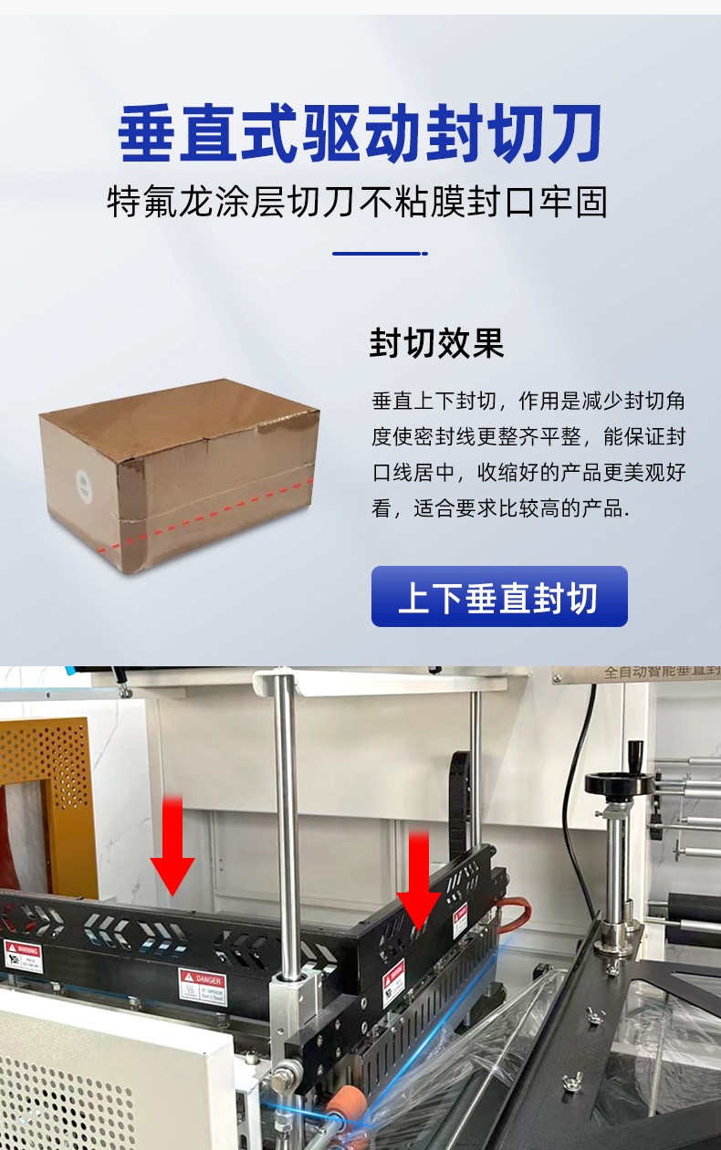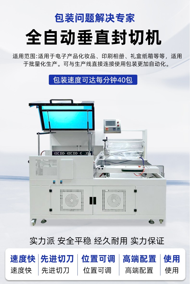 全自動(dòng)垂直封切熱收縮包裝機(jī)憑借高效自動(dòng)化、封口平整、適用范圍廣的特點(diǎn),適配多行業(yè)的產(chǎn)品包裝需求,尤其適合需要批量包裝、追求外觀整潔或需防潮防塵防護(hù)的物品。垂直封切上下驅(qū)動(dòng),封口均勻無折皺,適合高度方向尺寸大的產(chǎn)品;L 型封切效率更高,適合扁平小件批量包裝。