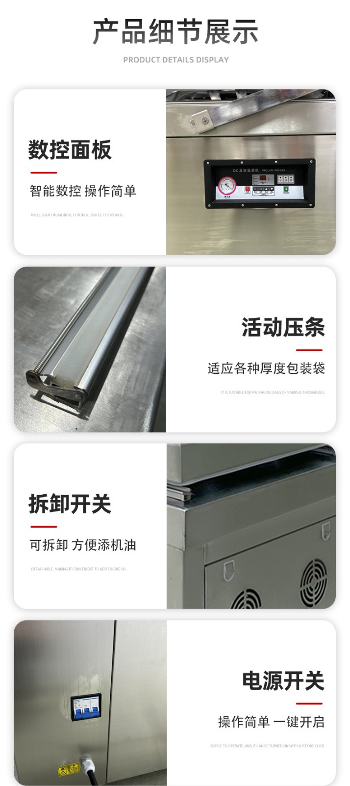 - 真空室:通常由不銹鋼制成,具有兩個(gè)對(duì)稱的工作室,可同時(shí)進(jìn)行真空包裝操作,提高工作效率。工作室底部為平板狀,便于放置包裝物品,且易于清潔。